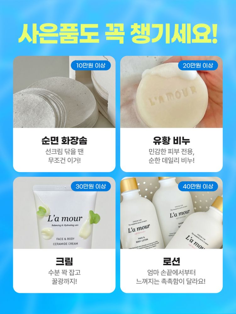 ⏰️ 올여름 마지막 공구선 로션 3+1선 로션 3개+클렌징 워터🎁 사은품도 꼭 챙기세요10만원 이상 순면 화장솜20만원 이상 유황 비누30만원 이상 크림40만원 이상 로션을 증정해요🚨 이번 공구 지나면 끝!이번에 무조건 쟁이세요