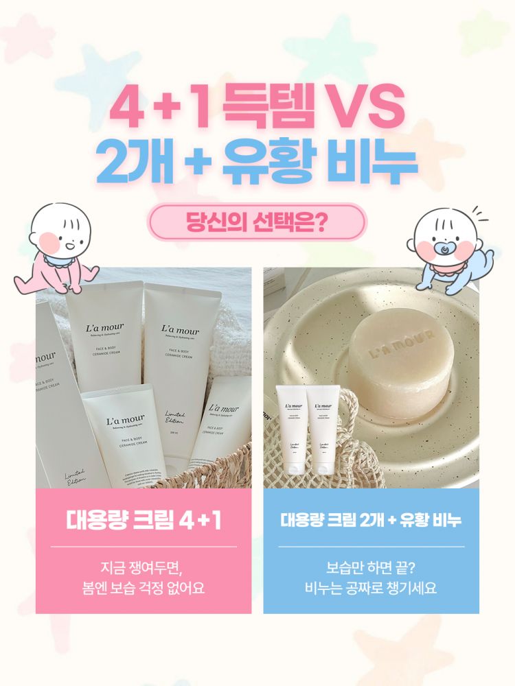 4+1 득템 VS 2개+유황 비누당신의 선택은? 👶대용량 크림 4+1대용량 크림 2개+유황 비누🎁 사은품도 꼭 챙기세요30만원 이상 시카 밤40만원 이상 워시50만원 이상 호호바 오일60만원 이상 앰플을 증정해요