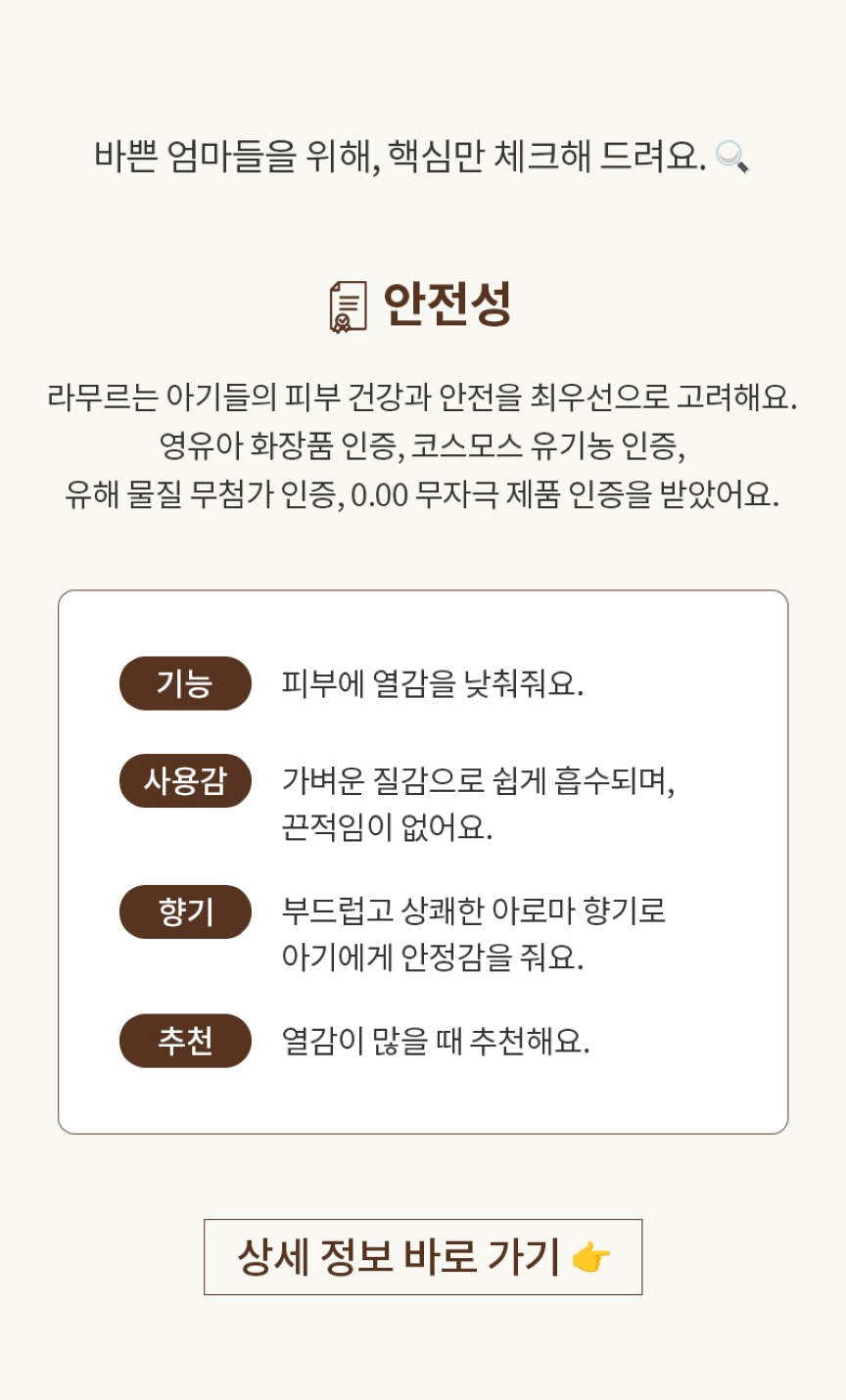 라무르는 아기들의 피부 건강과 안전을 최우선으로 고려해요!